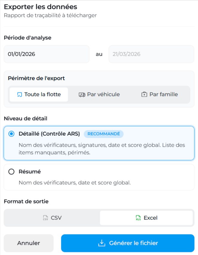 - Format XLS ou CSV — directement exploitable par l'inspecteur ou intégrable à ses outils internes