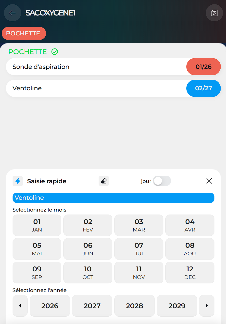 Si vous avez besoin de précision — par exemple pour un médicament avec une date limite au 15/08/25 — vous pouvez activer la saisie du jour en un clic. L'alerte sera alors déclenchée à cette date exacte.