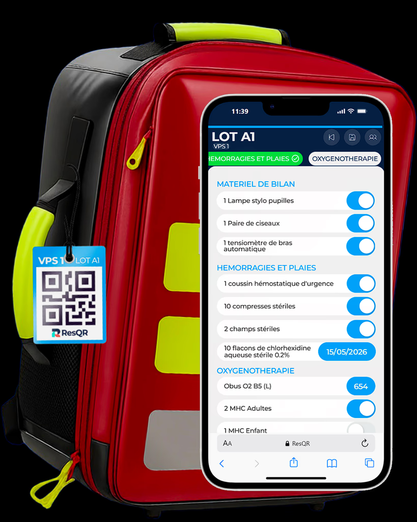Avec ResQR, ce lot vit dans l'application comme n'importe quel autre matériel. Sa checklist est configurée une fois. À chaque vérification périodique, l'état est tracé. Les consommables proches de péremption apparaissent en orange (à 3 mois ou moins, selon votre paramétrage), en rouge à échéance. Vous n'avez pas à vous souvenir de quand le lot a été contrôlé pour la dernière fois — l'application vous le dit, et vous alerte si un contrôle est en retard.